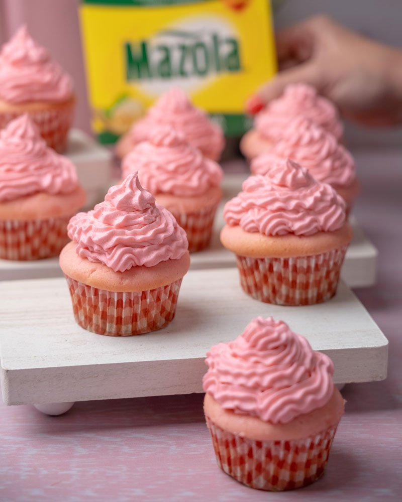 - Usa el buttercream rosado para decorar cubiletes previamente preparados con mezcla de caja, aplicándolo con una manga pastelera o con espátula según prefieras.